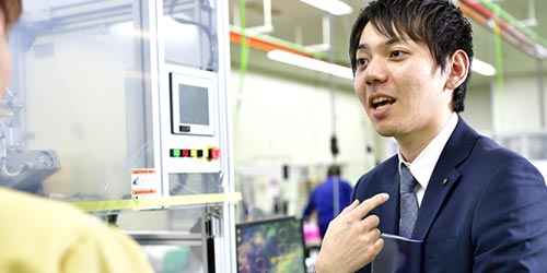 当社は国内5カ所に営業拠点を設置しており、私は東京の営業拠点に所属しています。担当エリアのお客様にコイルやモーターなどの生産設備をご提案するのが、私たち営業の仕事です。単に設備を売るのではなく、お客様が抱えている課題を解決できるような提案をする、これが当社の営業スタイルであり、入社1〜2年目は先輩の仕事をサポートしながら当社独自の仕事の進め方をたたき込んできました。実際、「巻線を自動化したい」「生産効率を高めたい」など、お客様はさまざまな課題を抱えています。時には、お客様が気づいていない“潜在的ニーズ”を掘り起こすことも少なくありません。まだ営業の経験が浅く、先輩には及びませんが、お客様の期待を超えるご提案ができるよう、お客様とのコミュニケーションを何よりも大切にしています。
